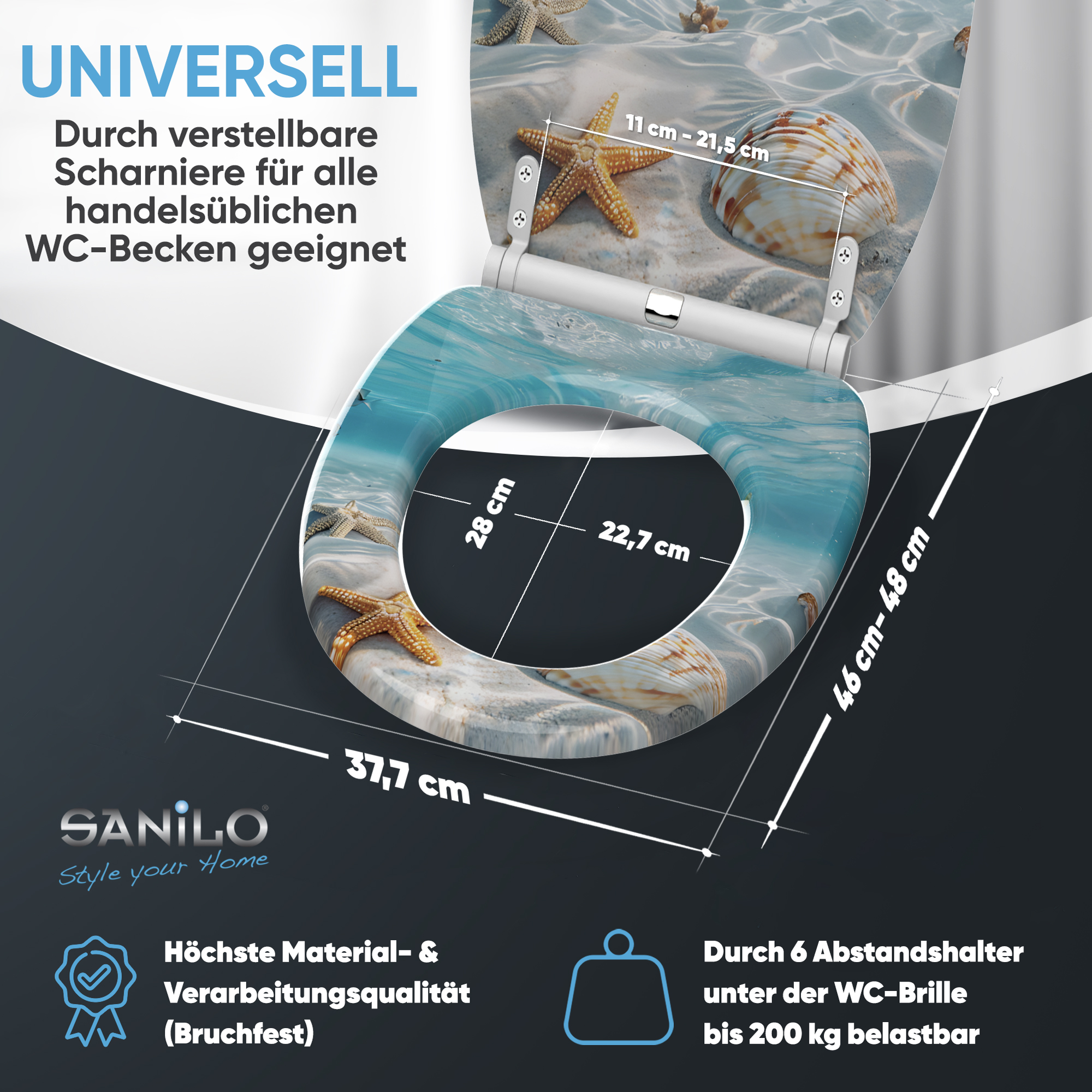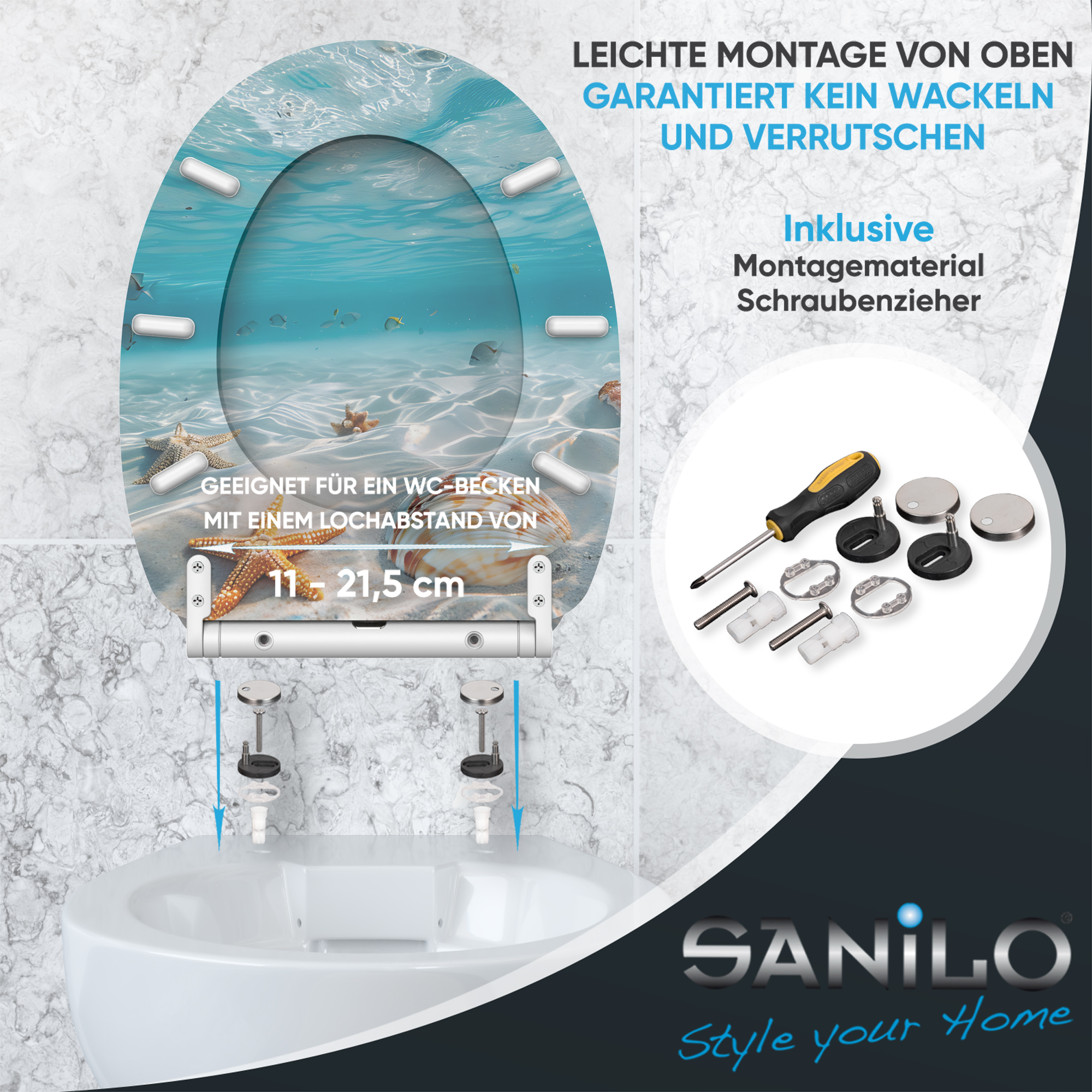 • Adjustable hinges to toilet bowl for all spacing 11,0 - 20,5 cm